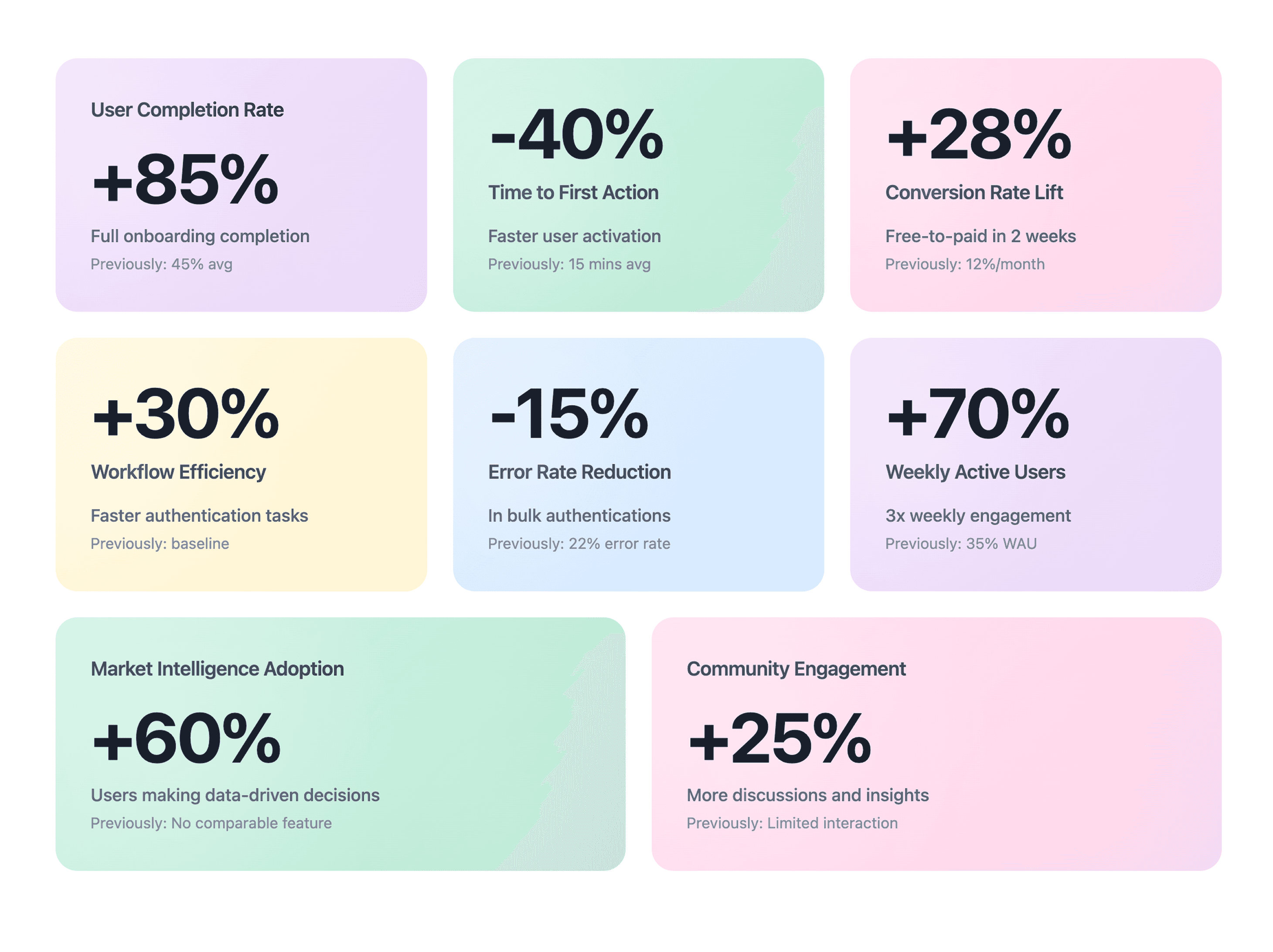 After launch, NexMark saw a strong and positive response from users. More people completed onboarding, started using the app faster, and reported smoother workflows with fewer errors. The new features made it easier for users to make data-driven decisions, while community participation and weekly activity grew steadily. These results show how thoughtful design and continuous user feedback turned NexMark into a more engaging, efficient, and trusted experience.
