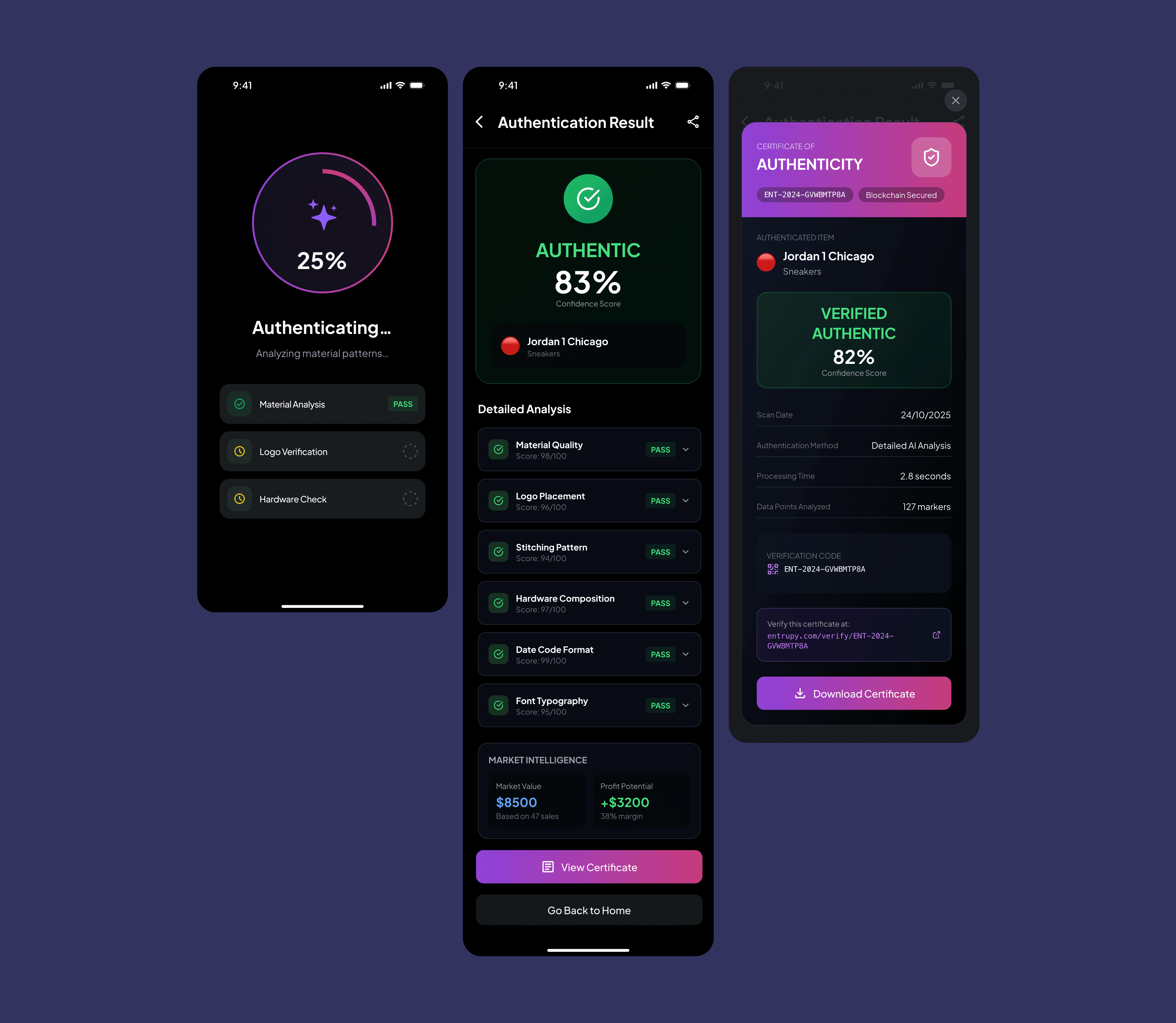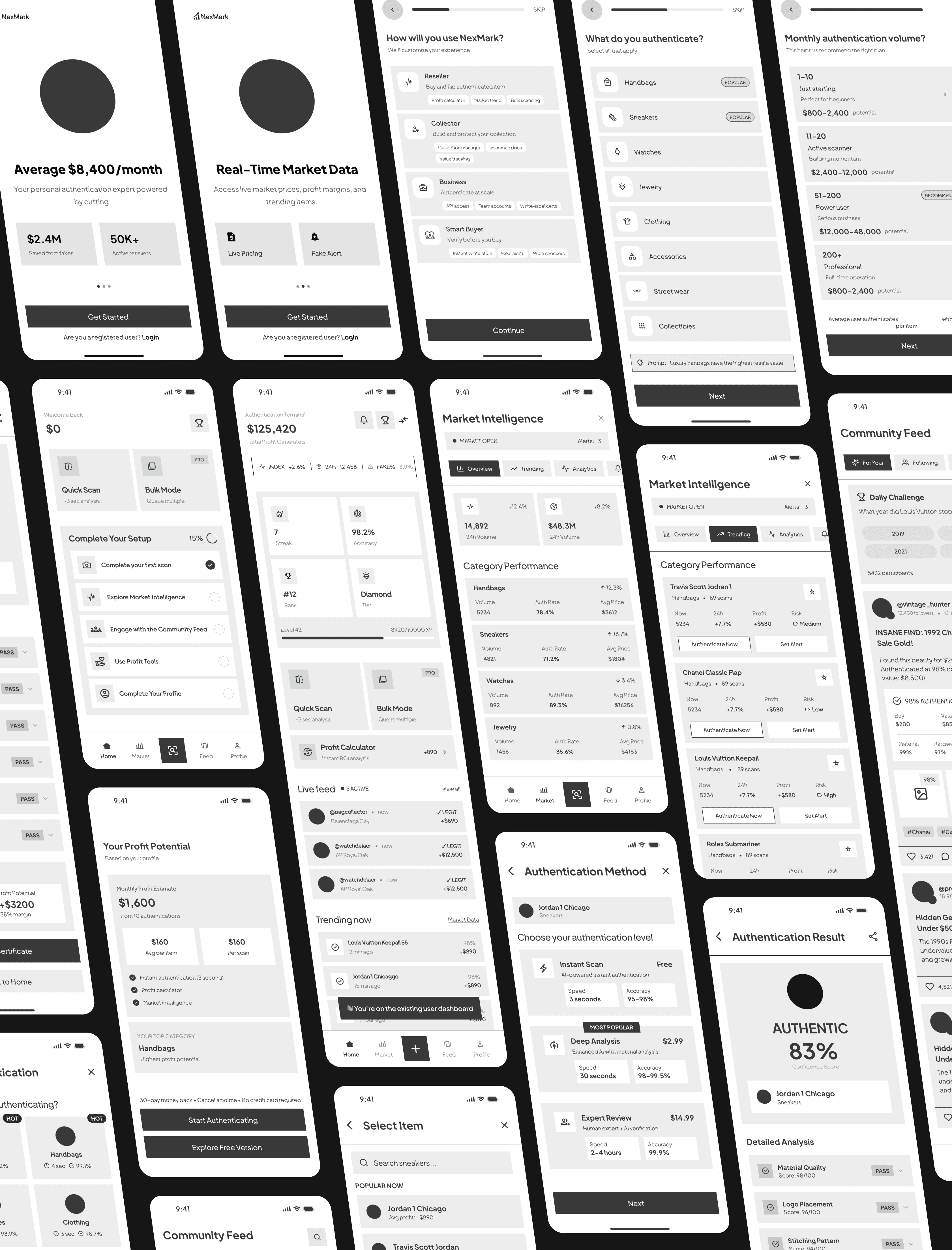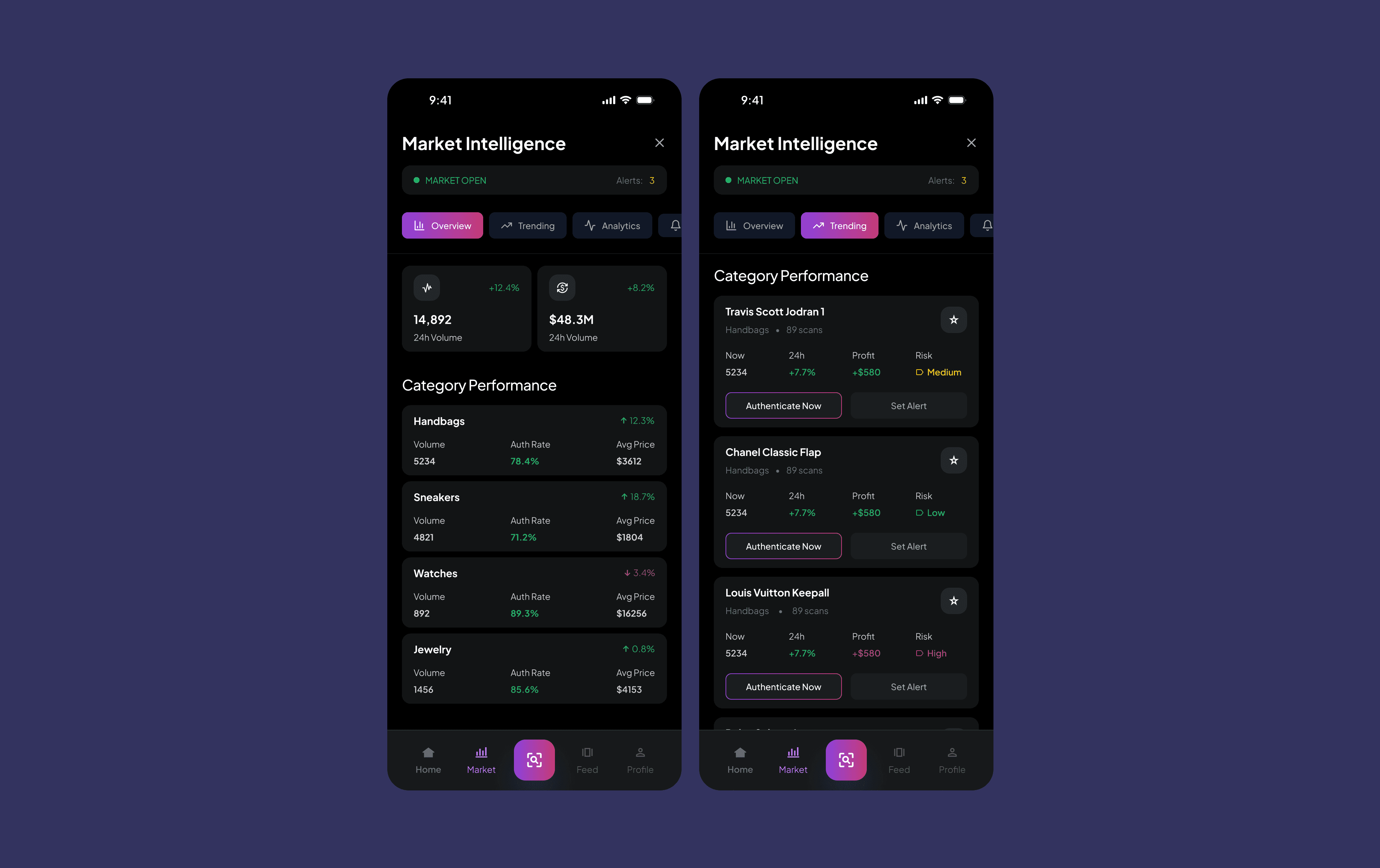 AuthenIQ is an AI-powered authentication platform that helps resellers, small businesses, and collectors verify the authenticity of luxury goods in seconds. The challenge? The existing authentication process was slow, manual, and didn’t support the needs of power users who were scanning dozens of items daily. I led the design of a complete mobile experience that transformed authentication from a one-time verification tool into an addictive, profit-focused platform with market intelligence and community features.