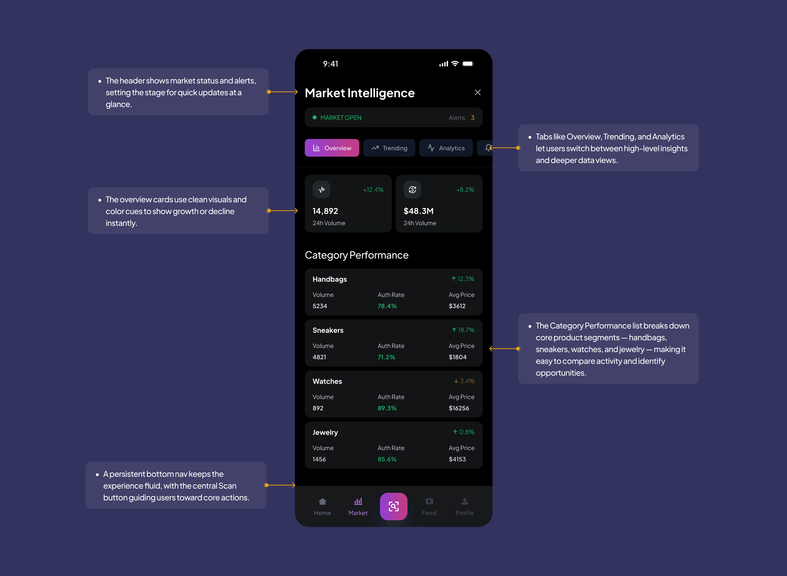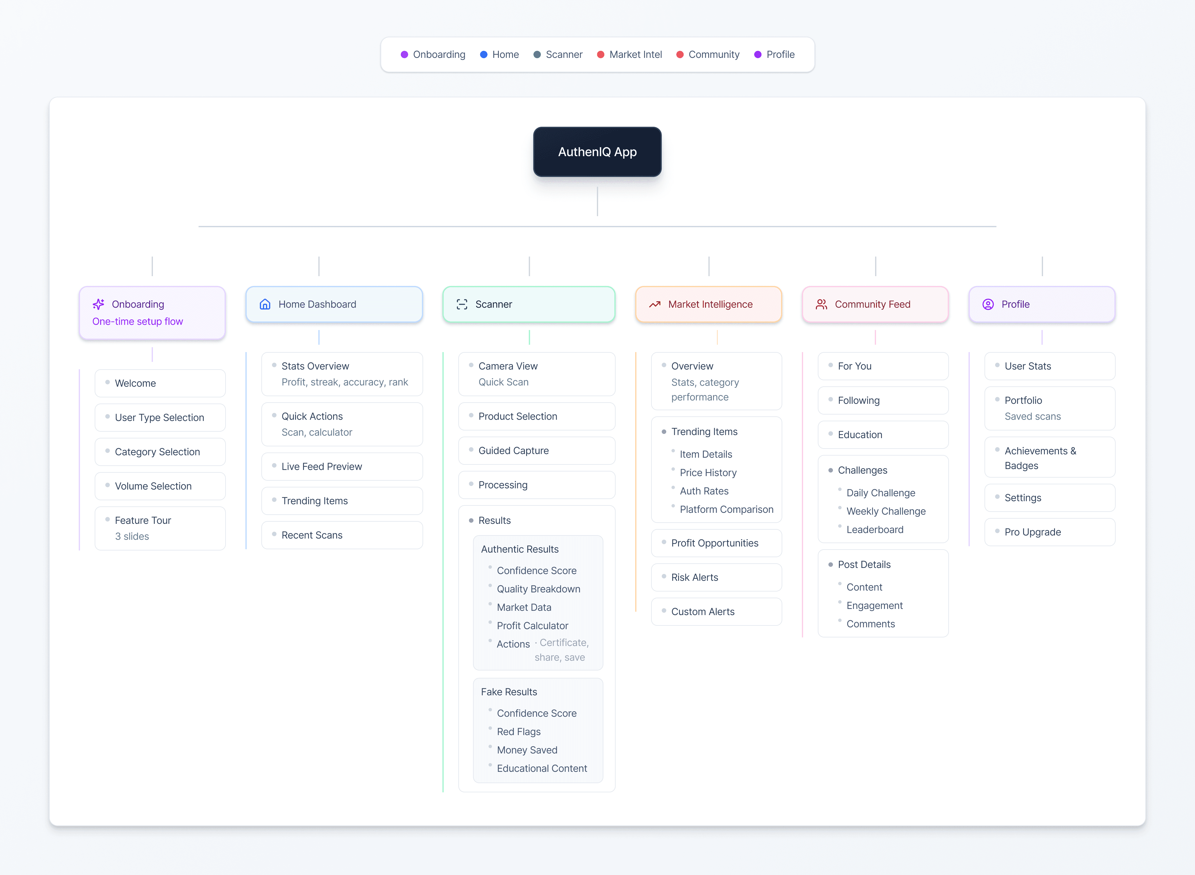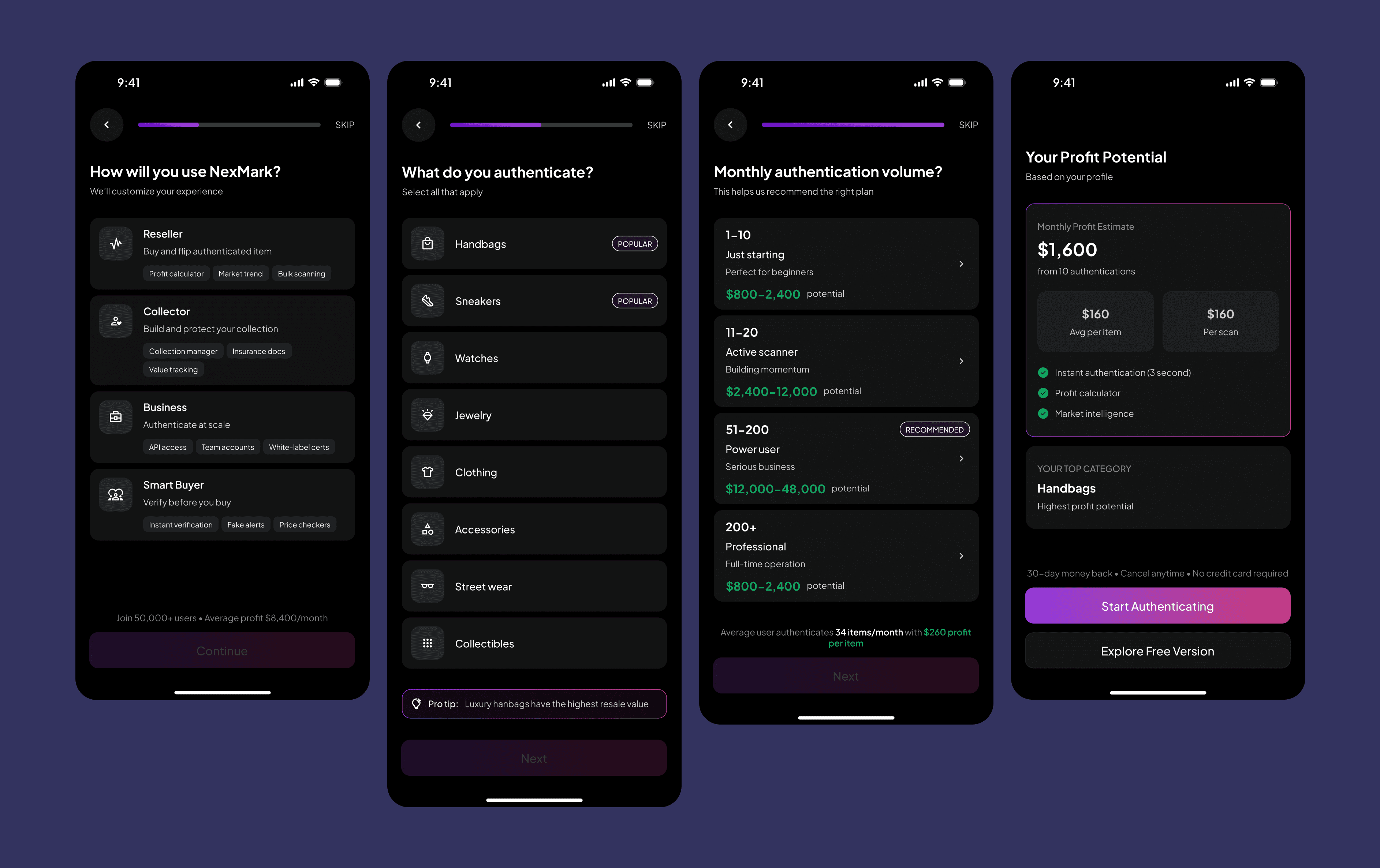 AuthenIQ is an AI-powered authentication platform that helps resellers, small businesses, and collectors verify the authenticity of luxury goods in seconds. The challenge? The existing authentication process was slow, manual, and didn’t support the needs of power users who were scanning dozens of items daily. I led the design of a complete mobile experience that transformed authentication from a one-time verification tool into an addictive, profit-focused platform with market intelligence and community features.