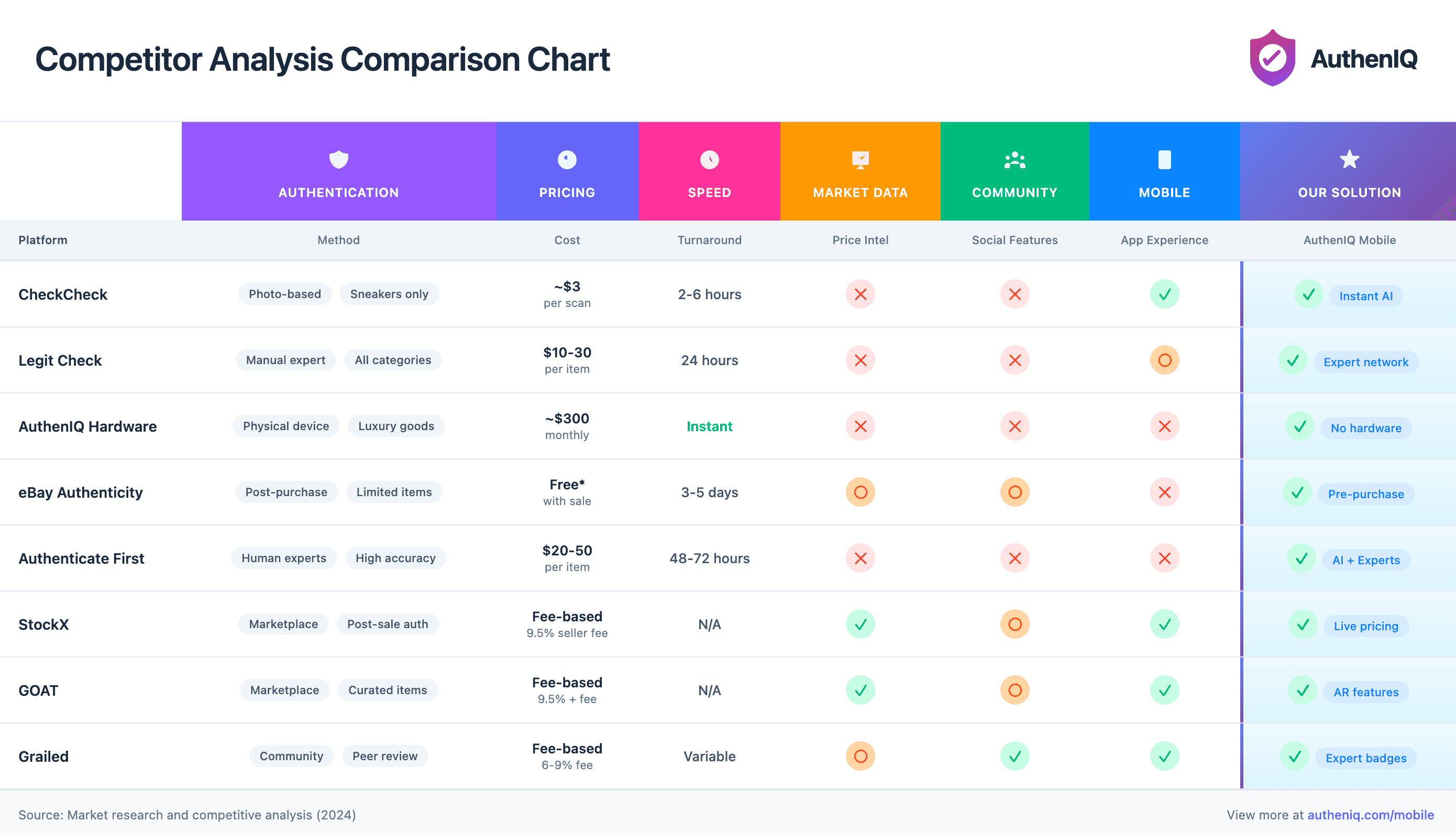 To ground our strategy and avoid reinventing the wheel, we conducted a focused competitive analysis across eight platforms—five direct authentication solutions and three adjacent resale/marketplace products. The goal wasn’t just to compare features, but to understand user expectations, market gaps, and where Entrupy could deliver differentiated value.