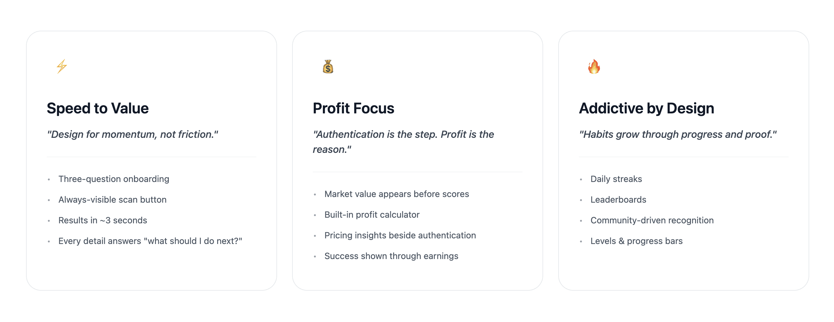 After our research, it became clear that users weren’t just looking for an authentication tool—they were trying to make fast, informed, confident business decisions. To keep us aligned, I defined three design principles that served as our compass throughout the project.