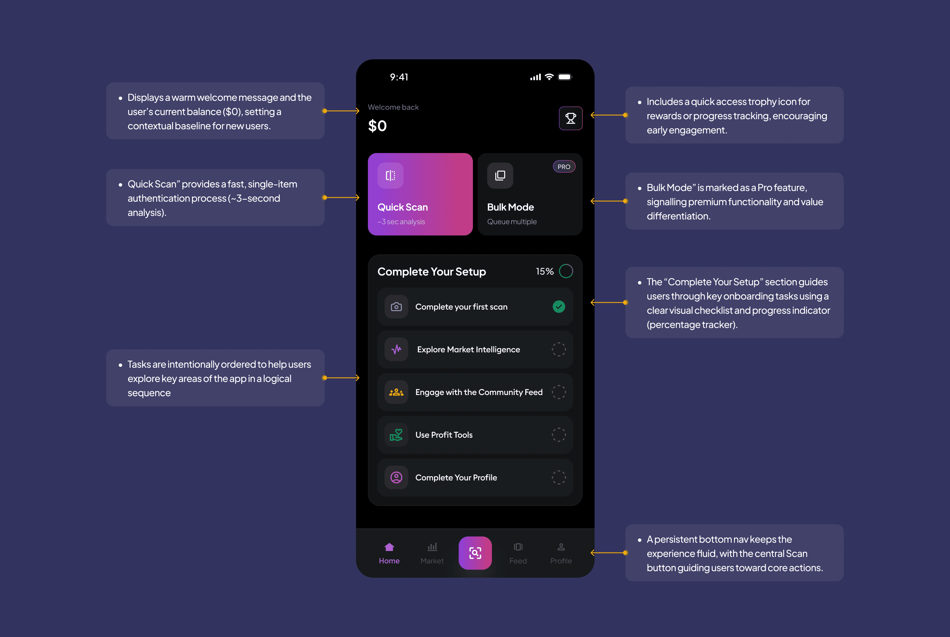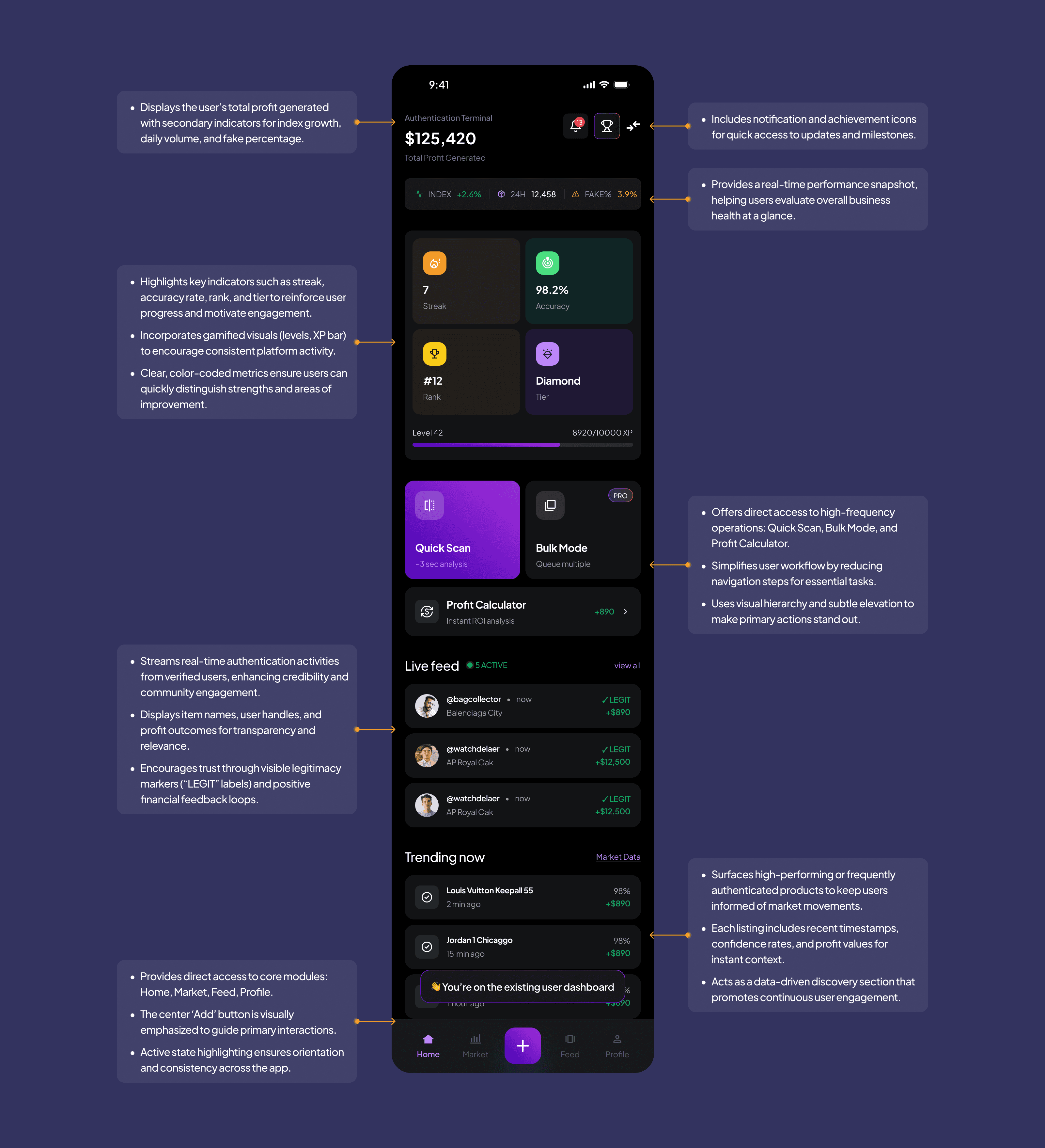The Home screen provides users with an at-a-glance overview of their key performance metrics and activity. The top section highlights total profit, authentication index, and accuracy rate, enabling users to quickly assess the business's health. The dashboard includes progress-based gamification elements (streaks, rank, and tier) to boost engagement. Below, action cards like Quick Scan, Bulk Mode, and Profit Calculator give users fast access to core functions. The Live Feed and Trending Now sections surface real-time authentication activity and market trends, keeping users connected to ongoing performance insights.