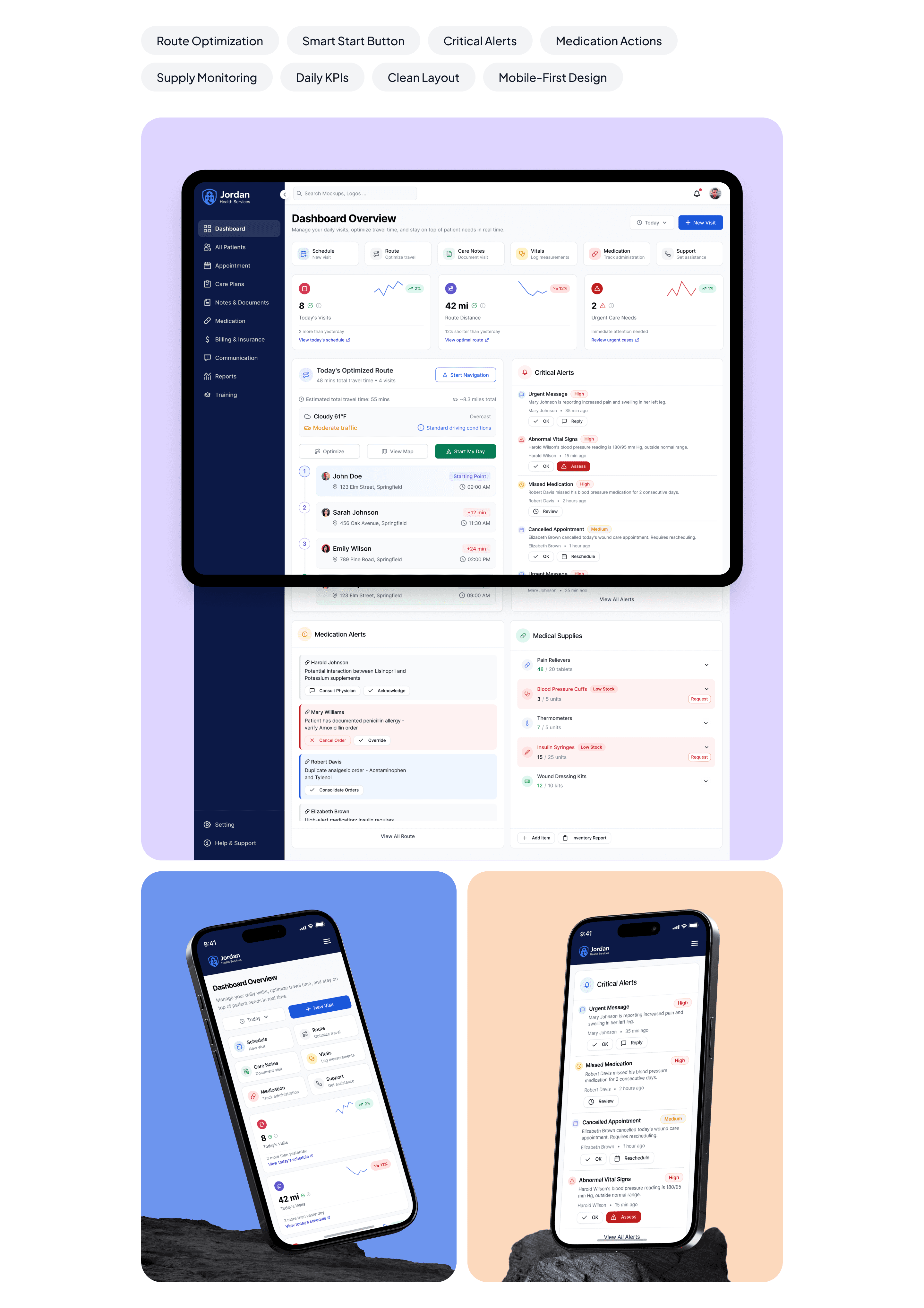 The new Dashboard Overview for Jordan Health Services is designed specifically for nurses and caregivers who conduct home visits. It offers a consolidated, real-time view of daily visits, route planning, patient alerts, and medication tracking—all in one accessible, responsive layout. This redesign aims to reduce cognitive load, minimize manual effort, and empower healthcare professionals with smarter tools to make informed decisions on the go.