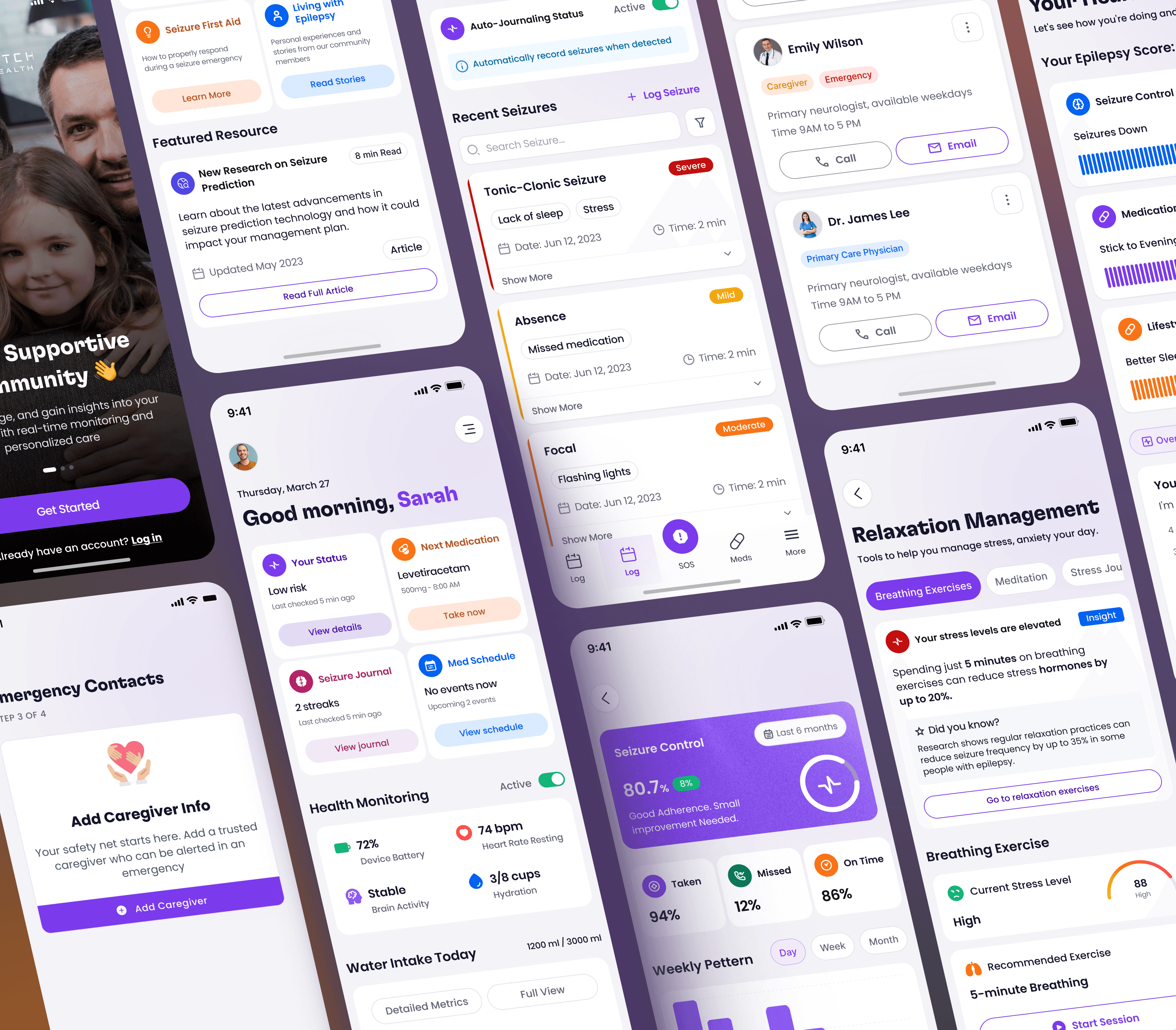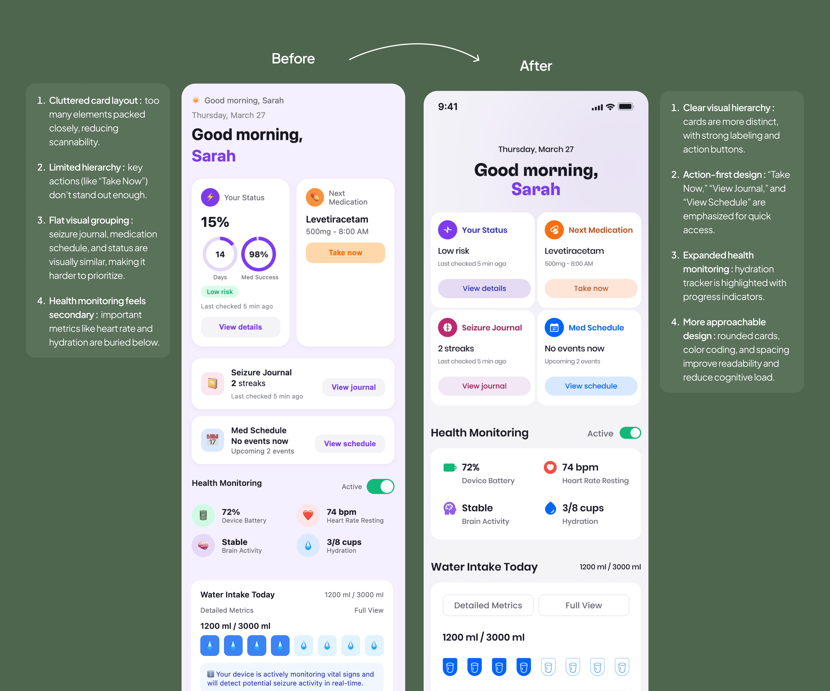 Personalized Dashboard: A welcoming greeting paired with top-priority health actions (status, next medication, seizure journal, and schedule) ensures users can take quick, meaningful steps each day.