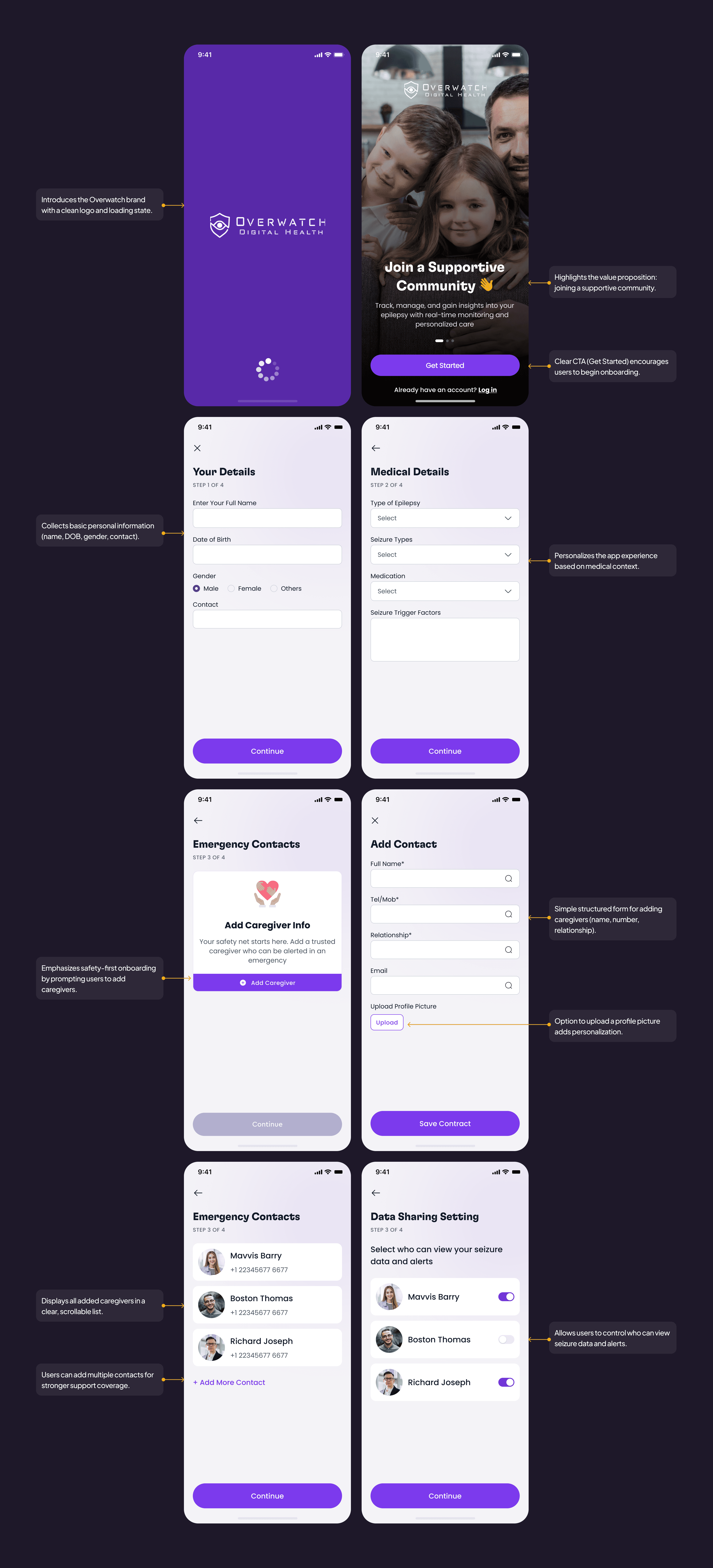 The wireframes depict a comprehensive suite of screens for the Overwatch Digital Health app, outlining a user-centric approach to epilepsy management. From onboarding to detailed medical profiling, emergency contacts, and alert settings, each screen is designed for ease and accessibility. They collectively streamline the management process, enhancing user engagement and ensuring crucial health information is at the user's fingertips. This layout is crafted to provide a seamless and supportive experience for users as they navigate their health journey with epilepsy